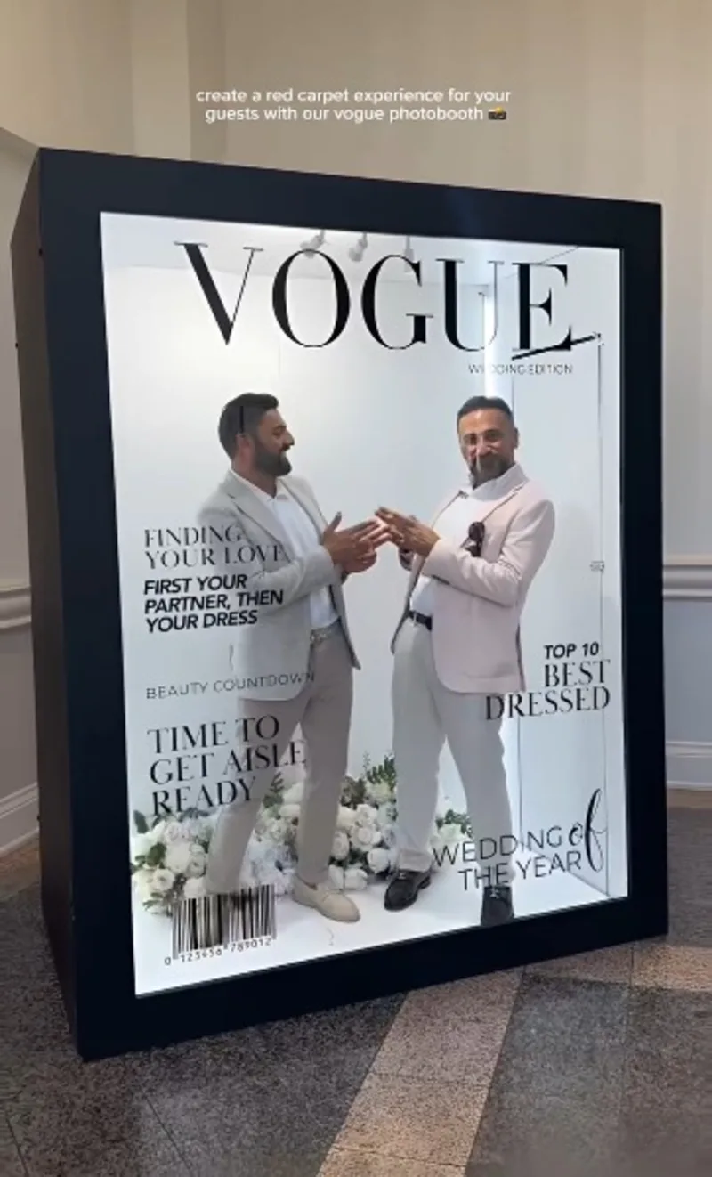 The Magazine Vogue photo booth is commonly positioned near entrances, reception areas or feature walls. It works well for exhibitions, brand launches, corporate parties, weddings and milestone celebrations.