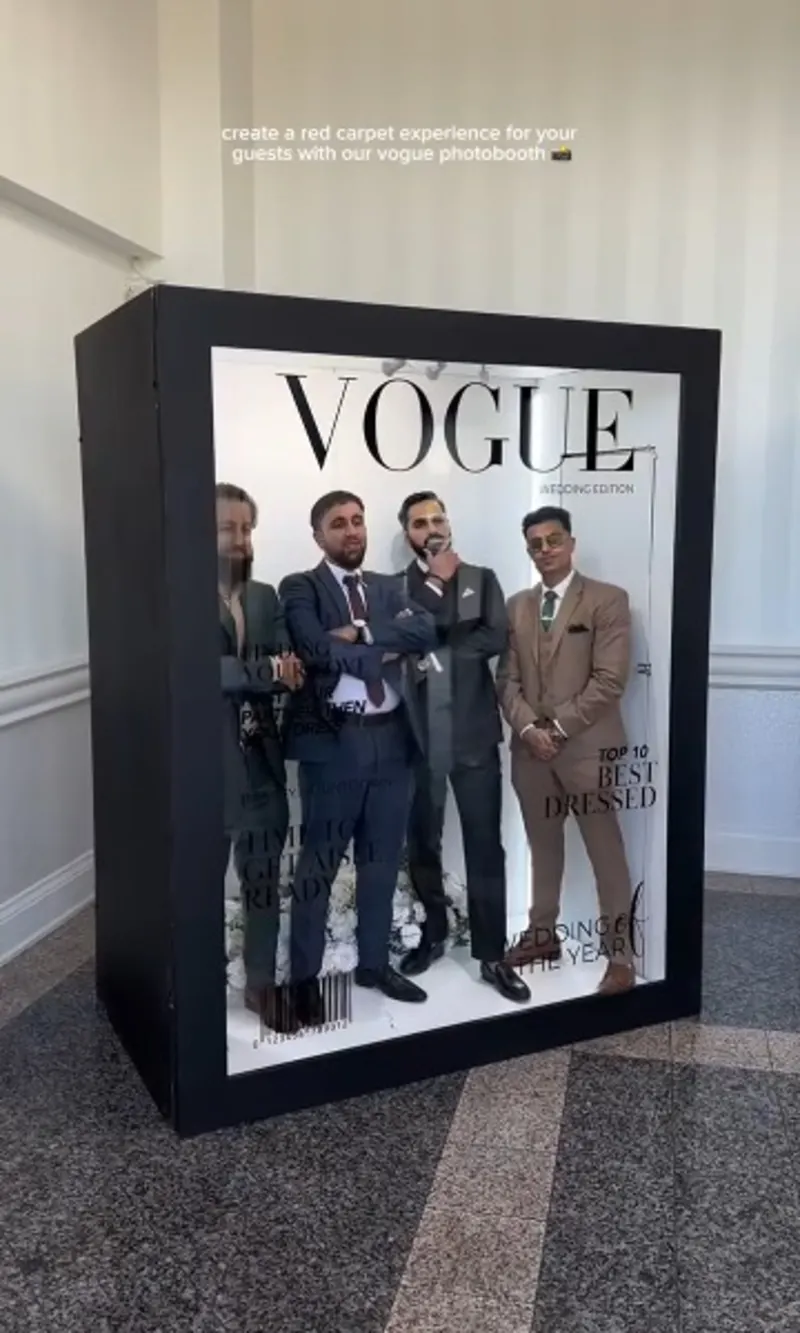 The Magazine Vogue photo booth offers a distinctive, magazine-style photo experience for events, exhibitions and private parties. Guests step into a custom-built booth styled like a Vogue cover, creating high-quality images that reflect your event branding and theme.